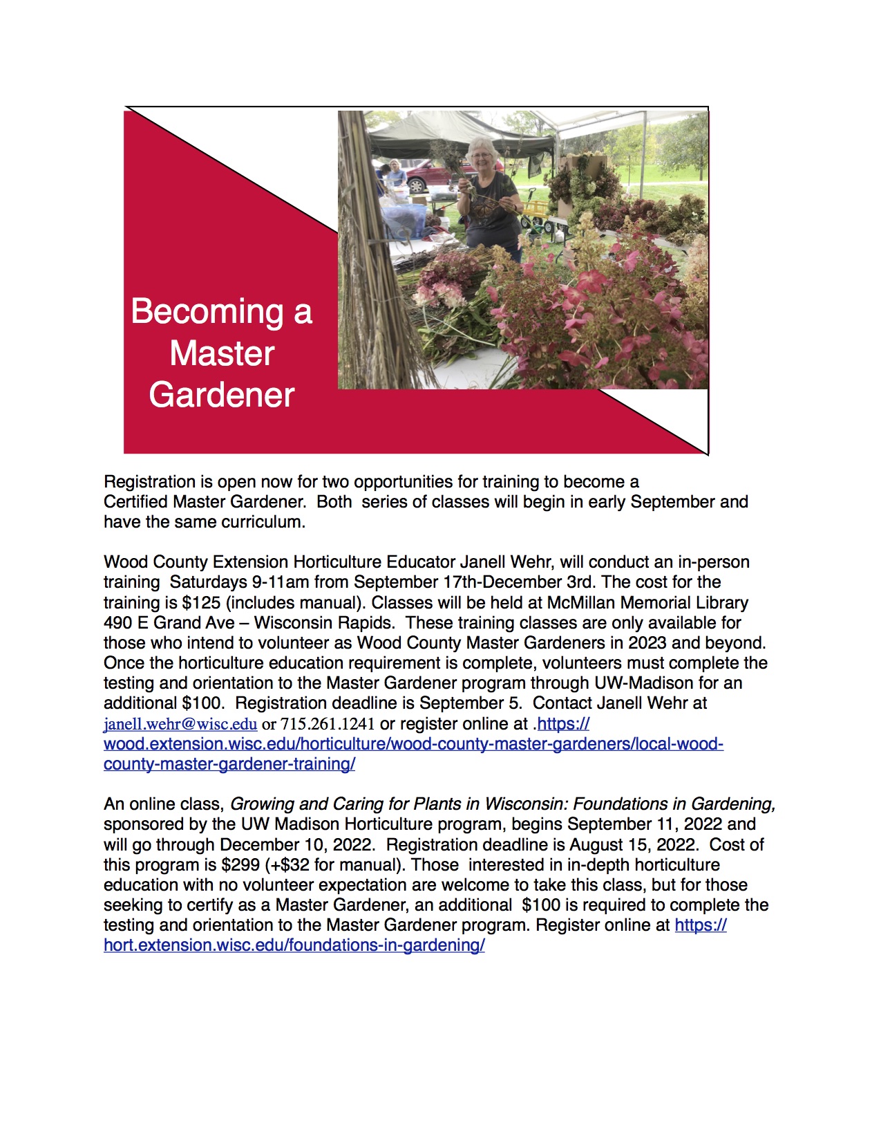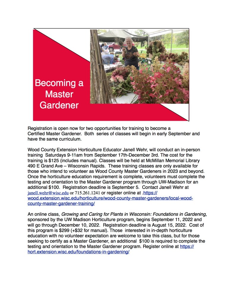 We’re sorry to announce that ALL of our programing must be put on hold for the foreseeable future, per the Wisconsin Master Gardener program and UW Extension, while our state and country work to defeat the coronovirus pandemic. This means we must cancel all monthly general membership meetings, Coffee Talks at the Libraries, Spring Plant Sale in May, Ask a Master Gardener booths at the farmer’s market, AND work at our gardening projects around the county.